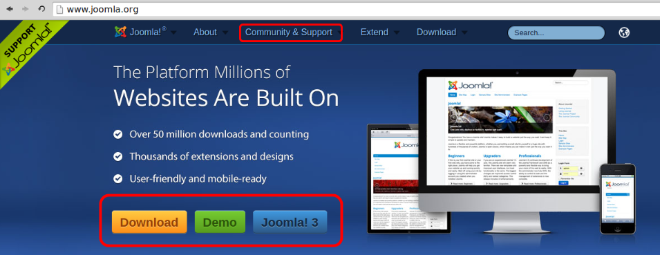 Самый простой и проверенный способ ー найти хостинг, где можно разместить Joomla автоматически. Также не лишним будет заглянуть на официальный сайт разработчиков Joomla. На главной странице вы найдете ссылку на скачивание и без проблем загрузите англоязычную версию. Здесь же можно найти сообщества, в которых вы без проблем найдете нужную информацию: