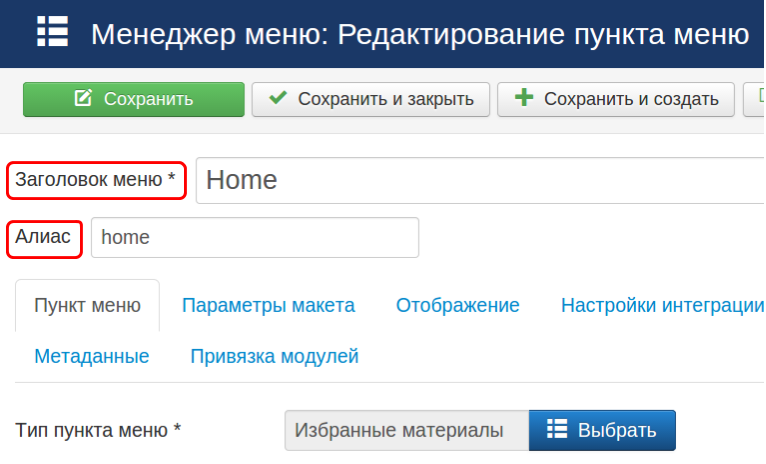 Нажмите на пункт меню, который вы намерены изменить и впишите новый заголовок. Не забудьте убрать текст в строке “Алиас”, поскольку он подтягивается автоматически. Сохраните изменения и готово: