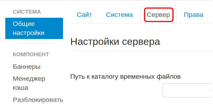 Рассмотрим три способа настройки почты в Joomla. Для начала зайдите админку сайта и найдите в левом меню “Общие настройки” → “Сервер”: