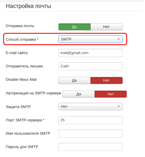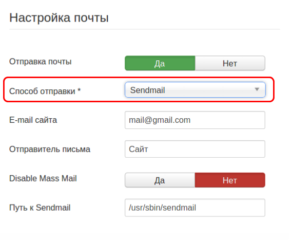 Теперь можно переходить непосредственно к настройке почты. Самым популярным считается PHPMail. В поле “Отправка почты” ставите “Да”, вписываете e-mail сайта, название портала, в поле Disable Mass Mail выбираете “Нет”: