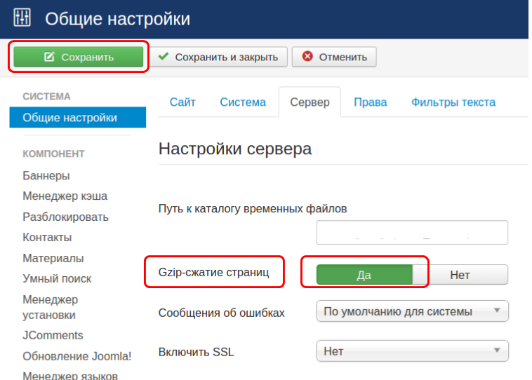 Один из самых эффективных и простых способов ー использование инструмента Gzip. Для того, чтобы настроить его, зайдите в панель управления сайтом: “Ситема” → “Общие настройки” → “Сервер”: